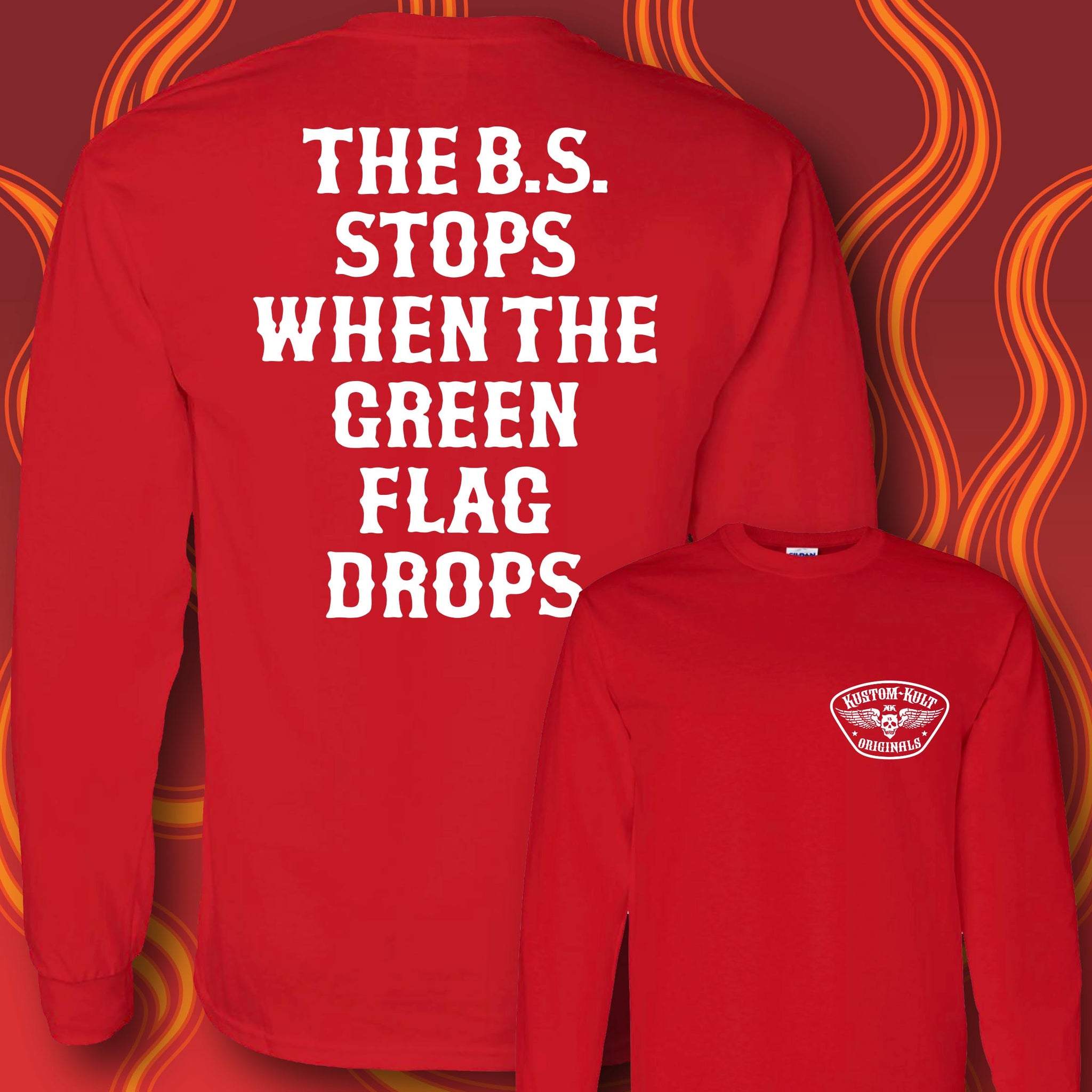 THE B.S. STOPS WHEN THE GREEN FLAG DROPS- Long Sleeve Tee - RED